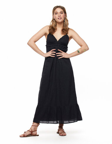 Modelo: Vestido largo escote pico antracita. Detalle de corte con volante y tirantes